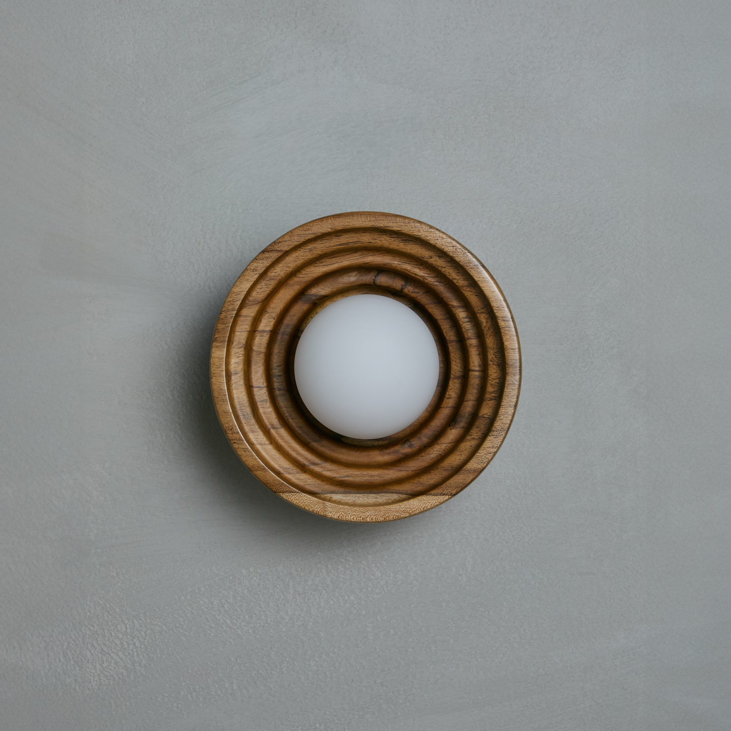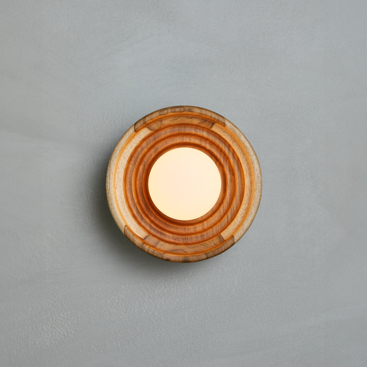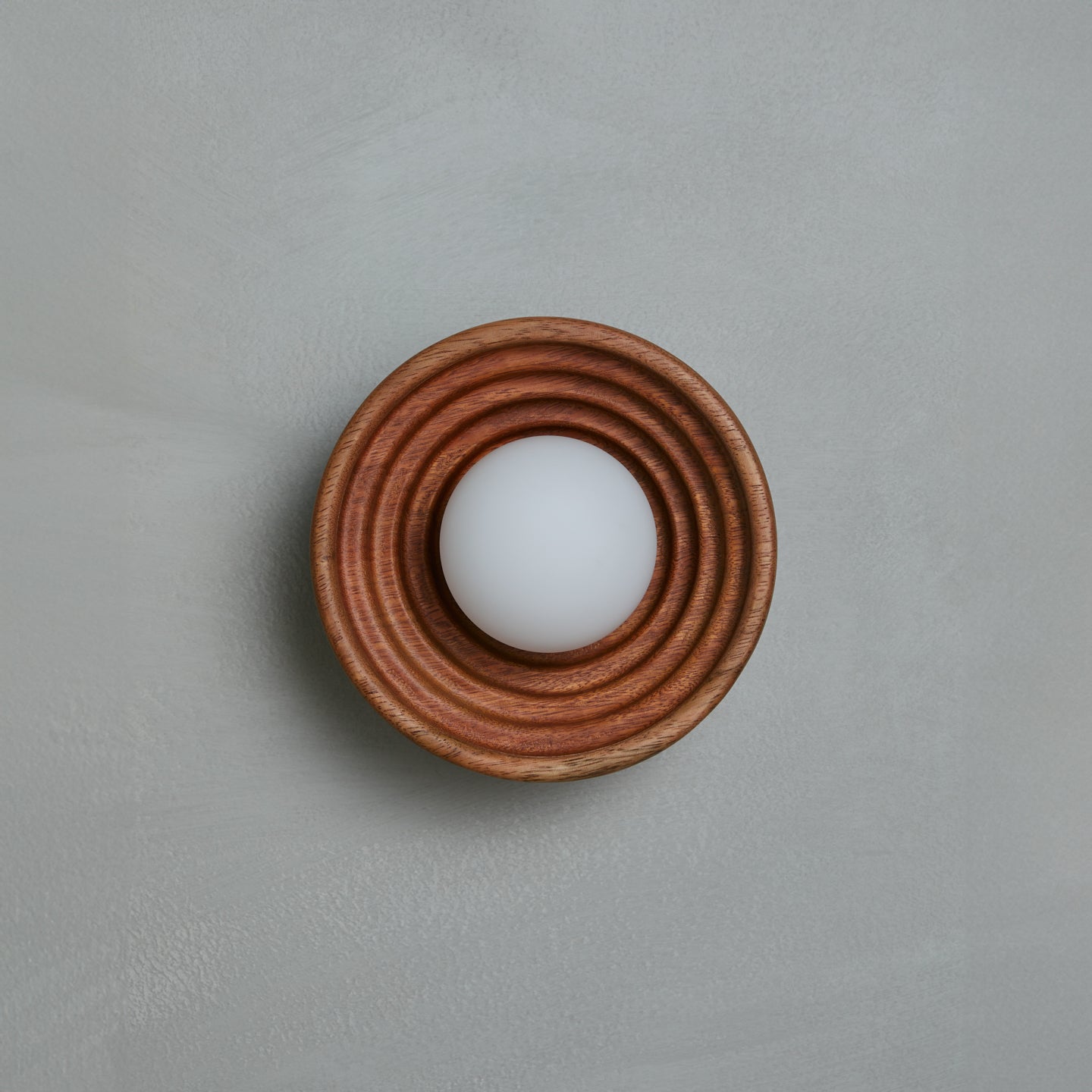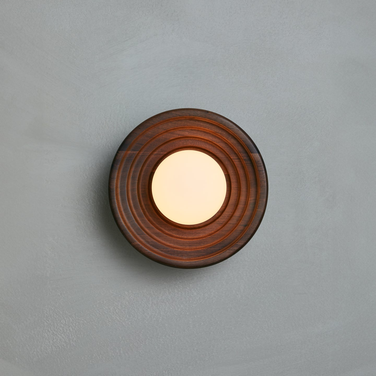 A CIRCULAR WALL SCONCE WITH CONCENTRIC CARVINGS THAT FRAME AN OPAL DIFFUSER. CRAFTED IN WOOD OR STONE IT EMITS A GENTLE GLOW EVOKING THE PRESENCE OF A LUMINOUS OBJECT EMERGING FROM WITHIN.