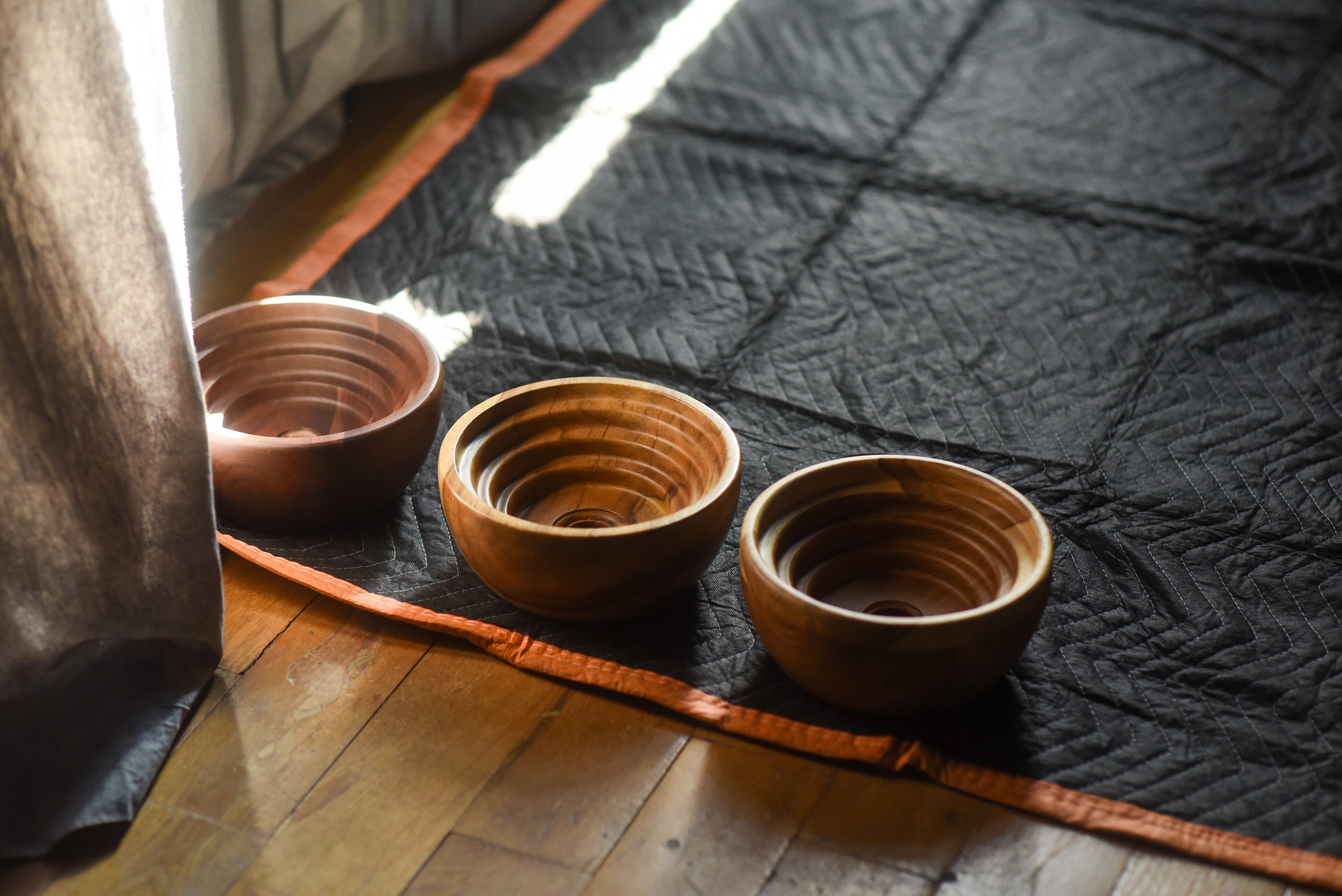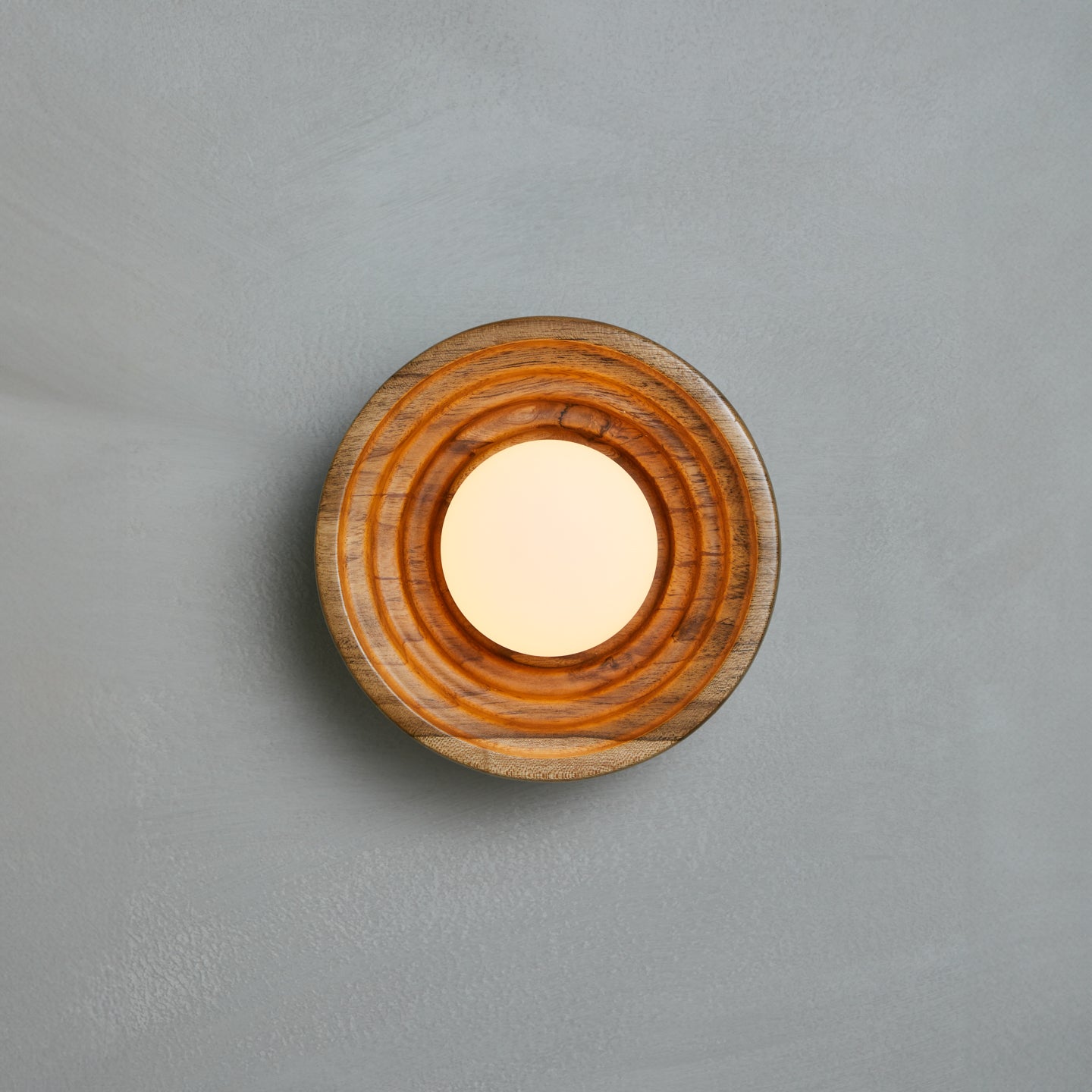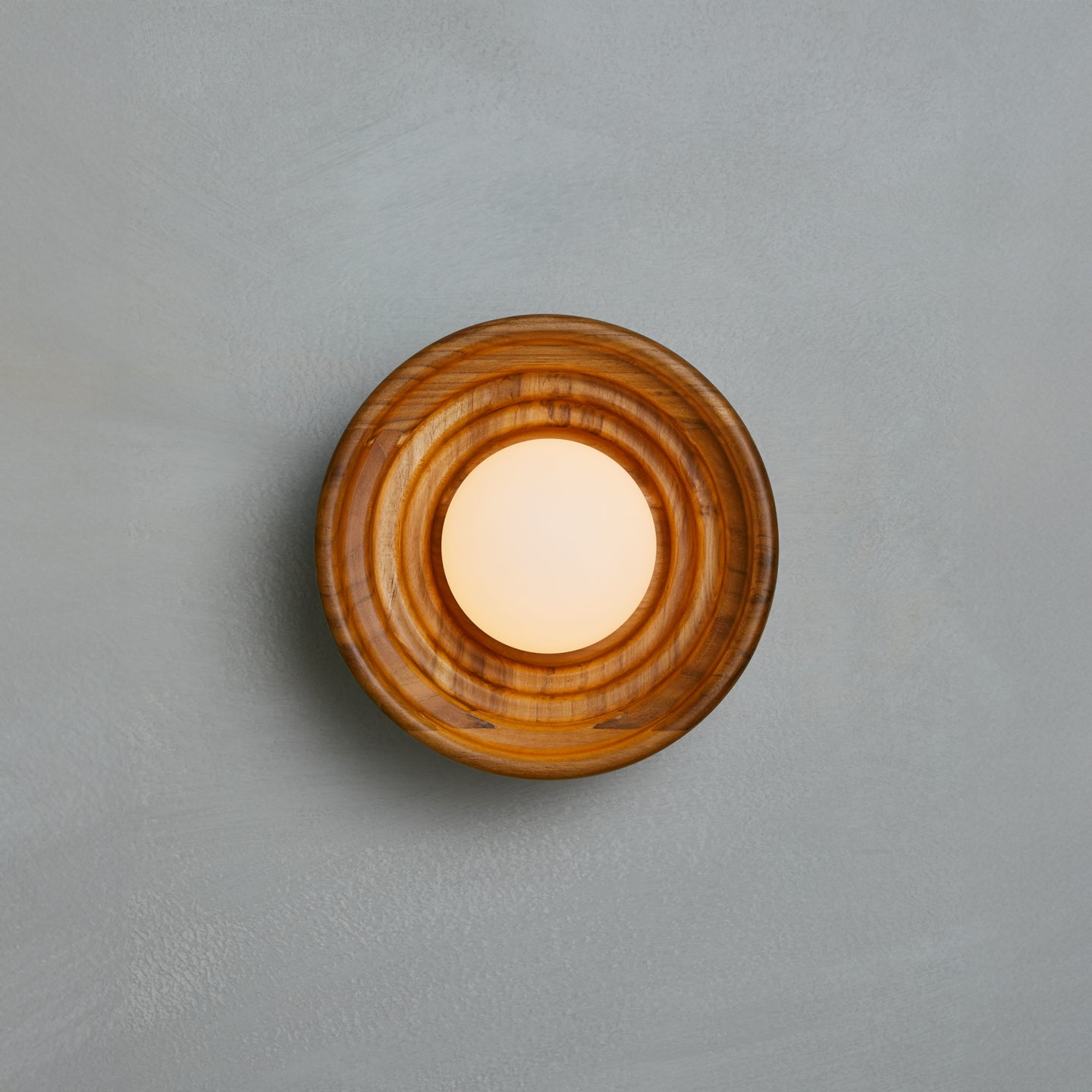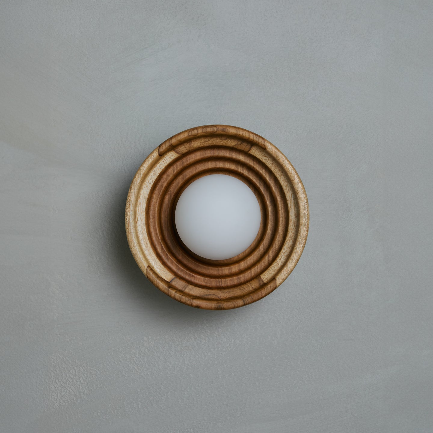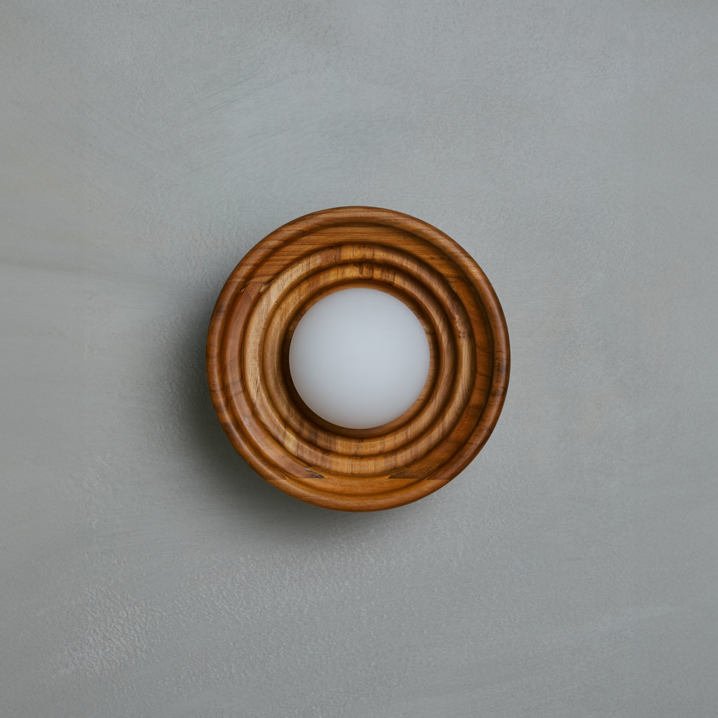 A CIRCULAR WALL SCONCE WITH CONCENTRIC CARVINGS THAT FRAME AN OPAL DIFFUSER. CRAFTED IN WOOD OR STONE IT EMITS A GENTLE GLOW EVOKING THE PRESENCE OF A LUMINOUS OBJECT EMERGING FROM WITHIN.