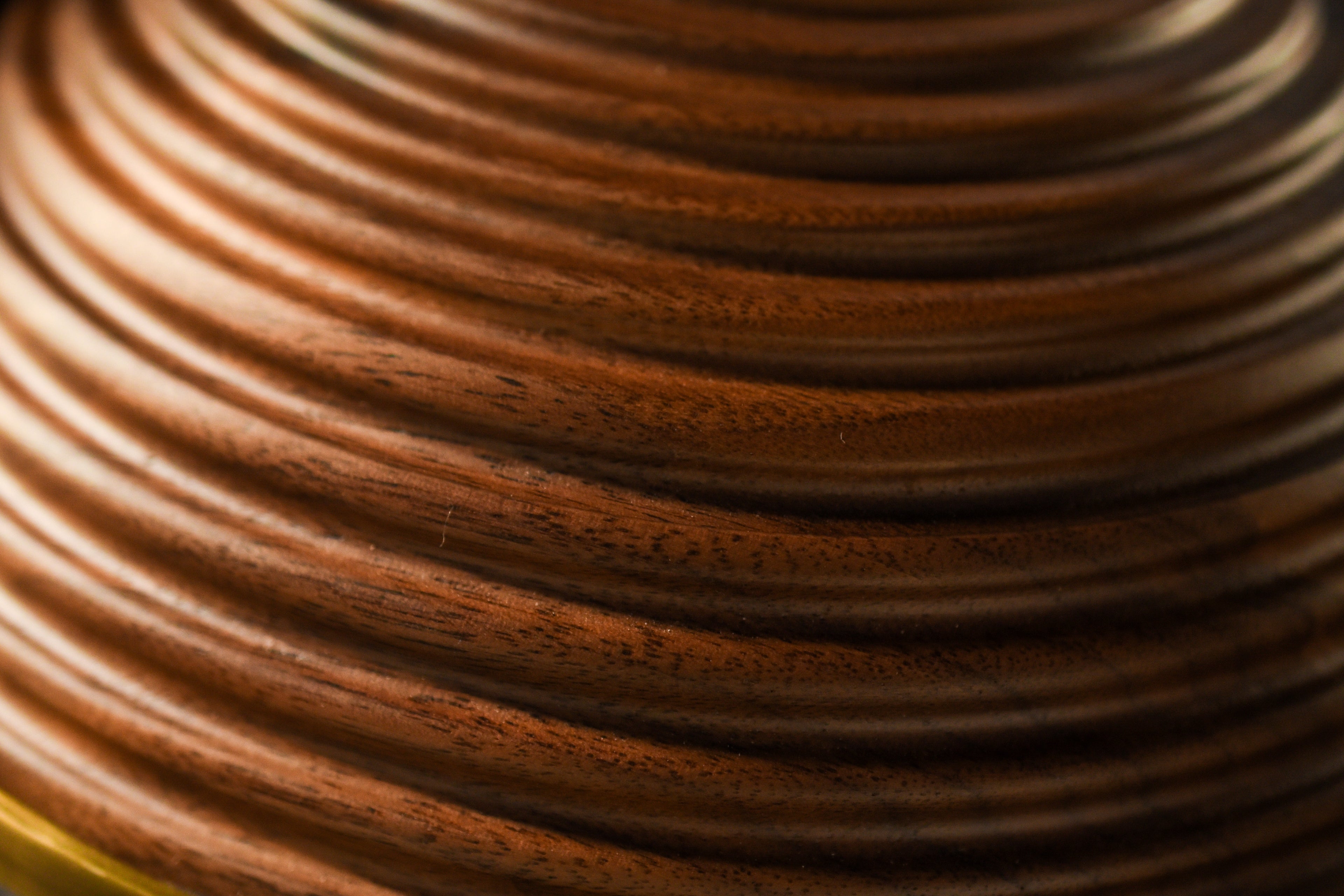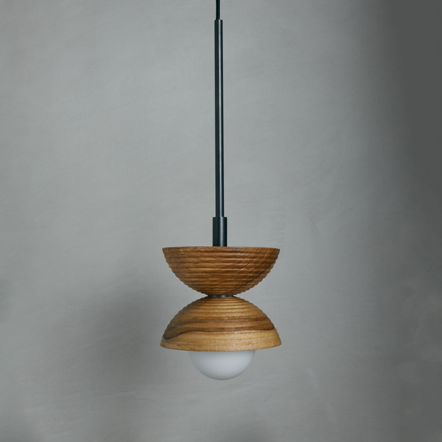 A PENDANT LIGHT COMPOSED OF TWO MIRRORED HALVES CARVED IN WOOD OR STONE. ITS SYMMETRICAL FORM FRAMES AN OPAL DIFFUSER THAT EMITS A WARM AND FOCUSED GLOW.