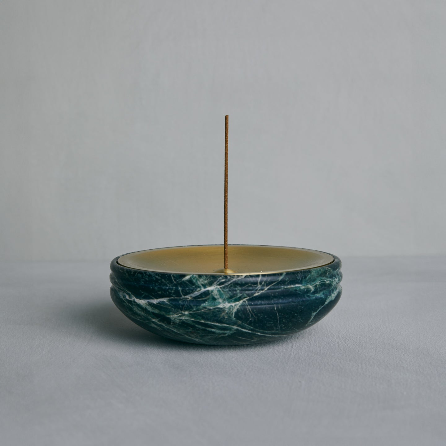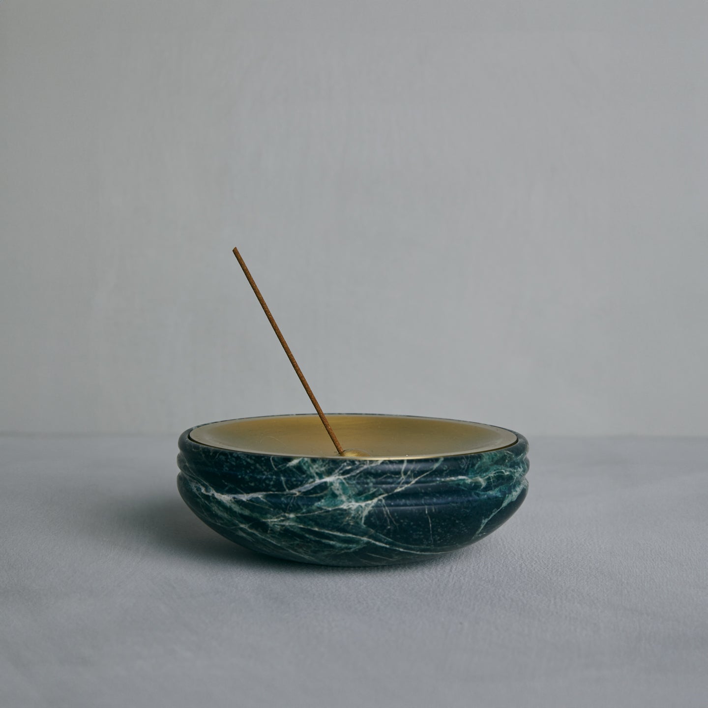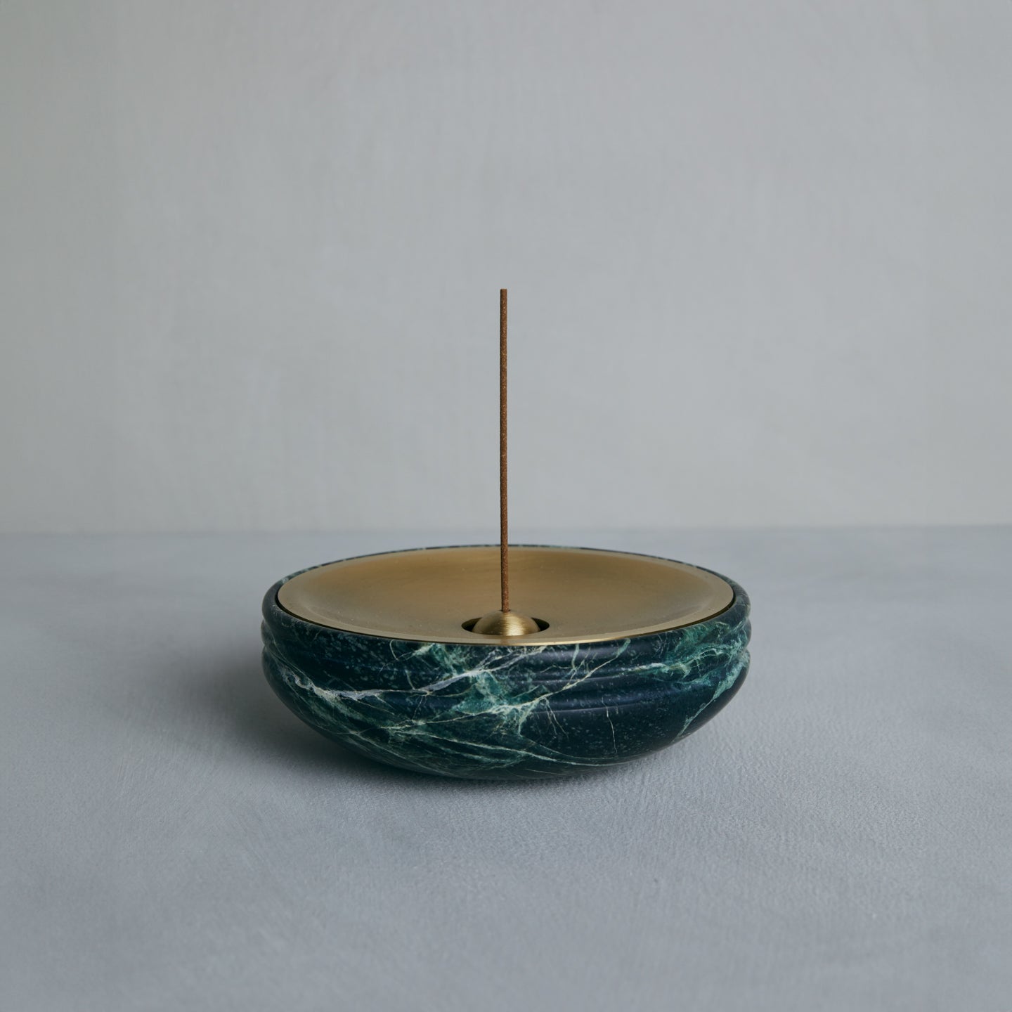 A ROUNDED VESSEL CARVED IN HONED STONE WITH A POLISHED INNER BASIN AND A SMALL SPHERE THAT HOLDS AN INCENSE STICK. THE SPHERE RESTS IN A CONCAVE SEAT CARVED INTO THE STONE MERGING FUNCTIONAL BALANCE WITH SCULPTURAL PRECISION.